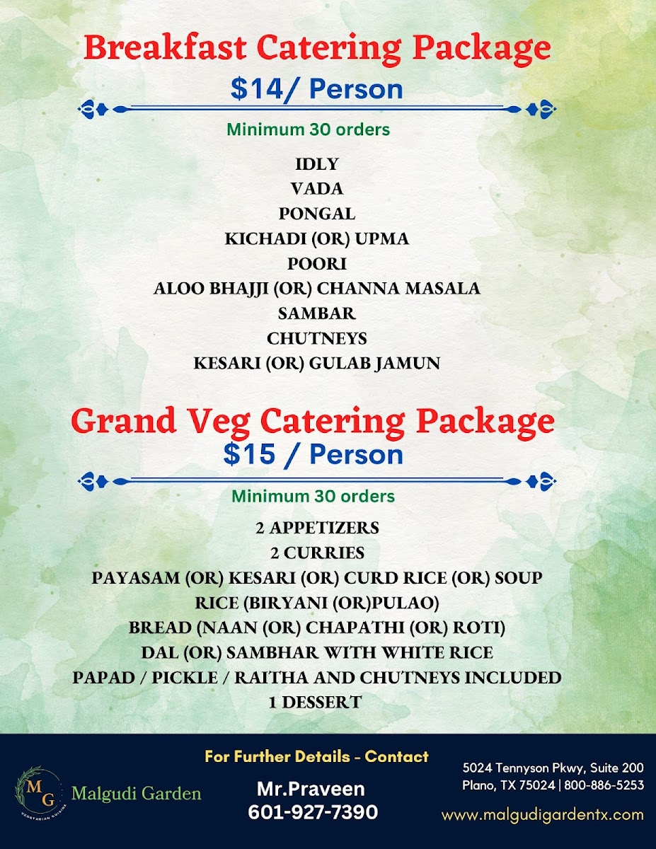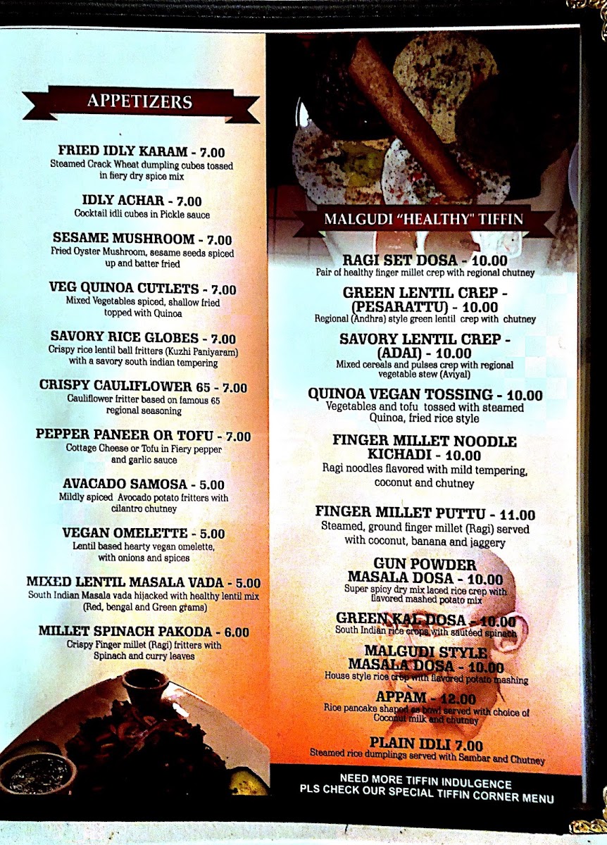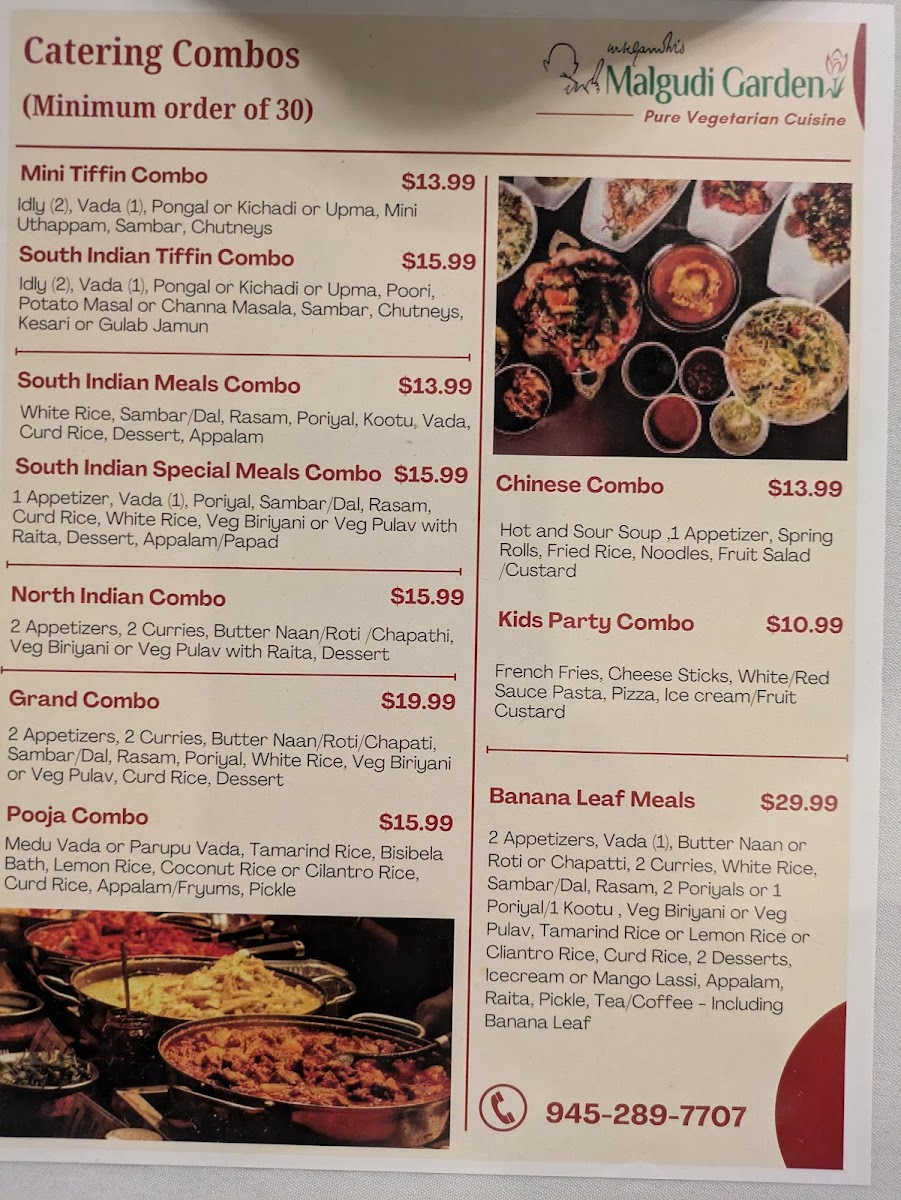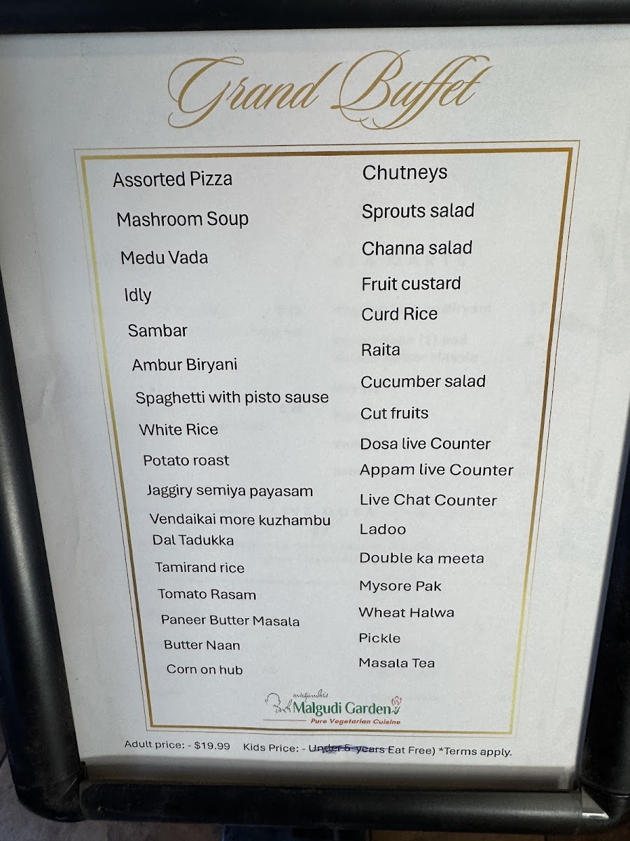 Malgudi Garden offers a thoughtfully curated menu that captures the essence of traditional Indian vegetarian cuisine with a focus on variety and comfort. The menu blends classic dishes with buffet-style dining, allowing guests to enjoy both familiar favorites and new flavors in a relaxed, family-friendly setting.